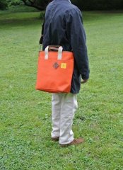 直売会用に少ロットで製作したクラシックなトートバッグです。機能を絞り込んでなるべくシンプルに作りましたが内側に仕切りポケット、5個の大きな底鋲、開口部にハトメと紐(ワックスコード)などが付いております。